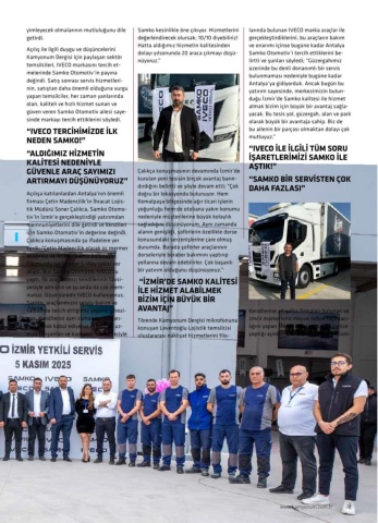 yimleyecek olmalarının mutluluğunu dile getirdi. Açılış ile ilgili duygu ve düşüncelerini Kamyonum Dergisi için paylaşan sektör temsilcileri, IVECO markasını tercih et-melerinde Samko Otomotiv’in payına değindi. Satış sonrası servis hizmetleri-nin, satıştan daha önemli olduğuna vurgu yapan temsilciler, her zaman yanlarında olan, kaliteli ve hızlı hizmet sunan ve güven veren Samko Otomotiv ailesi saye-sinde markayı tercih ettiklerini söyledi.“IVECO TERCİHİMİZDE İLK NEDEN SAMKO!”“ALDIĞIMIZ HİZMETİN KALİTESİ NEDENİYLE GÜVENLE ARAÇ SAYIMIZI ARTIRMAYI DÜŞÜNÜYORUZ”Açılışa katılanlardan Antalya’nın önemli firması Çetin Madencilik’in İhracat Lojis-tik Müdürü Soner Çalıkca, Samko Otomo-tiv’in İzmir’e gerçekleştirdiği yatırımdan memnuniyetlerini dile getirdi ve kendileri için Samko Otomotiv’in değerine değindi. Çalıkca konuşmasında şu ifadelere yer verdi; “Çetin Madencilik olarak üç mermer ocağımız ve iki fabrikamız bulunuyor. Filomuzda ise 14 adet S-Way çekici yer alıyor. Bizi Samko Otomotiv, IVECO’cu yaptı. İlk araçlarımızı kendilerinin tavsi-yesiyle almıştık ve şu anda da çok mem-nunuz. Uzun süredir IVECO kullanıyoruz. Samko, araçlarımızın servis-bakım ve tamirinde tercih ettiğimiz yegane adresi-miz. Kendilerini aynı zamanda dostları-mız olarak kabul ediyoruz. Alanında uz-man çalışanları ve kapsamlı hizmetleriyle Samko kesinlikle öne çıkıyor. Hizmetlerini değerlendirecek olursak; 10/10 diyebiliriz! Hatta aldığımız hizmetin kalitesinden dolayı yılsonunda 20 araca çıkmayı düşü-nüyoruz.” Çalıkça konuşmasının devamında İzmir’de kurulan yeni tesisin birçok avantaj barın-dırdığını belirtti ve şöyle devam etti; “Çok doğru bir lokasyonda bulunuyor. Hem Kemalpaşa bölgesinde ağır ticari işlerin yoğunluğu hem de otobana yakın konumu nedeniyle müşterilerine büyük kolaylık sağladığını düşünüyorum. Aynı zamanda alanın genişliği, şoförlerin özellikle dorse konusundaki serzenişlerine çare olmuş durumda. Burada şoförler araçlarının dorseleriyle beraber bakımını yaptırıp yollarına devam edebilirler. Çok başarılı bir yatırım olduğunu düşünüyoruz.” “İZMİR’DE SAMKO KALİTESİ İLE HİZMET ALABİLMEK BİZİM İÇİN BÜYÜK BİR AVANTAJ”Törende Kamyonum Dergisi mikrofonuna konuşan Leventoğlu Lojistik temsilcisi uluslararası nakliyat hizmetlerini filo-larında bulunan IVECO marka araçlar ile gerçekleştirdiklerini, bu araçların bakım ve onarımı içinse bugüne kadar Antalya Samko Otomotiv’i tercih ettiklerini be-lirtti ve şunları söyledi; “Güzergahımız üzerinde bu denli donanımlı bir servis bulunmaması nedeniyle bugüne kadar Antalya’ya gidiyorduk. Ancak bugün bu yatırım sayesinde, merkezimizin bulun-duğu İzmir’de Samko kalitesi ile hizmet almak bizim için büyük bir avantaj sağla-yacak. Bu tesis yol, güzergah, alan ve park olarak büyük bir avantaja sahip. Biz de bu ailenin bir parçası olmaktan dolayı çok mutluyuz.”“IVECO İLE İLGİLİ TÜM SORU İŞARETLERİMİZİ SAMKO İLE AŞTIK!”“SAMKO BİR SERVİSTEN ÇOK DAHA FAZLASI”Kendilerine ait şahıs firmaları bulunan ve zincir marketlerin meyve-sebze taşımacı-lığını yapan Mesut Karakaş ise dergimize yaptığı açıklamada IVECO markasını Sam-9www.kamyonum.com.tr