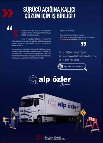 130’sektöre kazandırıldı.dan fazla sürücü Akademi“SÜRÜCÜ AÇIĞINA KALICI ÇÖZÜM İÇİN İŞ BİRLİĞİ !“ektörümüzün en büyük operasyonel engellerinden biri hâline gelen nitelikli sürücü eksikliği, artık çözüm buldu.Temel TIR Kaptanı Yetiştirme Programı'yla belge sahibi ama deneyimsiz adayları, eğitimli, uygulamalı olarak sınanmış ve sektöre hazır sürücülere dönüştürüyoruz.Eğitmenlerimiz, Milli Eğitim Bakanlığı, TOSFED ve Master Driver sertifikalarına sahip, alanında yetkin uzmanlardan oluşmaktadır. Tüm adaylarımız eğitimlerini hem sınıf ortamında teorik olarak hem de gerçek saha koşullarında, simülasyonlu uygulamalarla tamamlamaktadır.SEğer siz de filonuzda;Kalıcı sürücü çözümleri arıyorsanız,İş gücü planlamanızı güvenceye almak istiyorsanız,Operasyonel süreklilik hedefliyorsanız,Gelin, birlikte çalışalım.İş birliği ve detaylı bilgi için:leventalpay@alpozlerakademi.com0 (312) 812 16 53alpozlerakademi.com