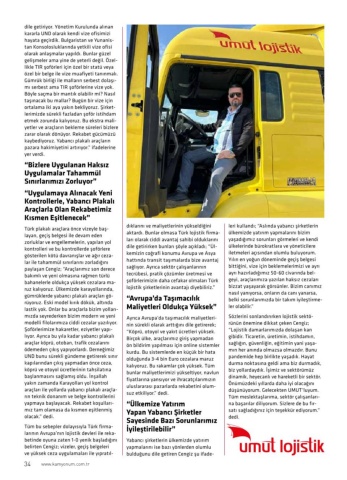 dile getiriyor. Yönetim Kurulunda alınan kararla UND olarak kendi vize ofisimizi hayata geçirdik. Bulgaristan ve Yunanis-tan Konsolosluklarında yetkili vize ofisi olarak anlaşmalar yapıldı. Bunlar güzel gelişmeler ama yine de yeterli değil. Özel-likle TIR şoförleri için özel bir statü veya özel bir belge ile vize muafiyeti tanınmalı. Gümrük birliği ile malların serbest dolaşı-mı serbest ama TIR şoförlerine vize yok. Böyle saçma bir mantık olabilir mi? Nasıl taşınacak bu mallar? Bugün bir vize için ortalama iki aya yakın bekliyoruz. Şirket-lerimizde sürekli fazladan şoför istihdam etmek zorunda kalıyoruz. Bu ekstra mali-yetler ve araçların bekleme süreleri bizlere zarar olarak dönüyor. Rekabet gücümüzü kaybediyoruz. Yabancı plakalı araçların pazara hakimiyetini artırıyor.” ifadelerine yer verdi.“Bizlere Uygulanan Haksız Uygulamalar Tahammül Sınırlarımızı Zorluyor”“Uygulamaya Alınacak Yeni Kontrollerle, Yabancı Plakalı Araçlarla Olan Rekabetimiz Kısmen Eşitlenecek”Türk plakalı araçlara önce vizeyle baş-layan, geçiş belgesi ile devam eden zorluklar ve engellemelerin, yapılan yol kontrolleri ve bu kontrollerde şoförlere gösterilen kötü davranışlar ve ağır ceza-lar ile tahammül sınırlarını zorladığını paylaşan Cengiz; “Araçlarımız son derece bakımlı ve yeni olmasına rağmen türlü bahanelerle oldukça yüksek cezalara ma-ruz kalıyoruz. Ülkemizde karayollarında, gümrüklerde yabancı plakalı araçları gö-rüyoruz. Eski model kırık dökük, altında lastik yok. Onlar bu araçlarla bizim yolları-mızda seyrederken bizim modern ve yeni modelli filolarımıza ciddi cezalar yazılıyor. Şoförlerimize hakaretler, eziyetler yapı-lıyor. Ayrıca bu yıla kadar yabancı plakalı araçlar köprü, otoban, trafik cezalarını ödemeden çıkış yapıyorlardı. Derneğimiz UND bunu sürekli gündeme getirerek sınır kapılarından çıkış yapmadan önce ceza, köprü ve otoyol ücretlerinin tahsilatına başlanmasını sağlamış oldu. İnşallah yakın zamanda Karayolları yol kontrol araçları ile yollarda yabancı plakalı araçla-rın teknik donanım ve belge kontrollerini yapmaya başlayacak. Rekabet koşulları-mız tam olamasa da kısmen eşitlenmiş olacak.” dedi.Tüm bu sebepler dolayısıyla Türk firma-larının Avrupa’nın lojistik devleri ile reka-betinde oyuna zaten 1-0 yenik başladığını belirten Cengiz; vizeler, geçiş belgeleri ve yüksek ceza uygulamaları ile yıpratıl-dıklarını ve maliyetlerinin yükseldiğini aktardı. Bunlar olmasa Türk lojistik firma-ları olarak ciddi avantaj sahibi olduklarını dile getirirken bunları şöyle açıkladı; “Ül-kemizin coğrafi konumu Avrupa ve Asya hattında transit taşımalarda bize avantaj sağlıyor. Ayrıca sektör çalışanlarının tecrübesi, pratik çözümler üretmesi ve şoförlerimizin daha cefakar olmaları Türk lojistik şirketlerinin avantajı diyebiliriz.”“Avrupa’da Taşımacılık Maliyetleri Oldukça Yüksek”Ayrıca Avrupa’da taşımacılık maliyetleri-nin sürekli olarak arttığını dile getirerek; “Köprü, otoyol ve yakıt ücretleri yüksek. Birçok ülke, araçlarımız giriş yapmadan ön bildirim yapılması için online sistemler kurdu. Bu sistemlerde en küçük bir hata olduğunda 3-4 bin Euro cezalara maruz kalıyoruz. Bu rakamlar çok yüksek. Tüm bunlar maliyetlerimizi yükseltiyor, navlun fiyatlarına yansıyor ve ihracatçılarımızın uluslararası pazarlarda rekabetini olum-suz etkiliyor.” dedi.“Ülkemize Yatırım Yapan Yabancı Şirketler Sayesinde Bazı Sorunlarımız İyileştirilebilir”Yabancı şirketlerin ülkemizde yatırım yapmalarını ise bazı yönlerden olumlu bulduğunu dile getiren Cengiz şu ifade-leri kullandı; “Aslında yabancı şirketlerin ülkemizde yatırım yapmalarını bizim yaşadığımız sorunları görmeleri ve kendi ülkelerinde bürokratlara ve yöneticilere iletmeleri açısından olumlu buluyorum. Yılın en yoğun döneminde geçiş belgesi bittiğini, vize için beklemelerimizi ve ayrı ayrı hazırladığımız 50-60 civarında bel-geyi, araçlarımıza yazılan haksız cezaları bizzat yaşayarak görsünler. Bizim canımız nasıl yanıyorsa, onların da canı yanarsa, belki sorunlarımızda bir takım iyileştirme-ler olabilir.”Sözlerini sonlandırırken lojistik sektö-rünün önemine dikkat çeken Cengiz; “Lojistik damarlarımızda dolaşan kan gibidir. Ticaretin, üretimin, istihdamın, sağlığın, güvenliğin, eğitimin yani yaşa-mın her anında olmazsa olmazdır. Bunu pandemide hep birlikte yaşadık. Hayat durma noktasına geldi ama biz durmadık, biz yollardaydık. İşimiz ve sektörümüz dinamik, heyecanlı ve hareketli bir sektör. Önümüzdeki yıllarda daha iyi olacağını düşünüyorum. Gelecekten UMUT’luyum. Tüm meslektaşlarıma, sektör çalışanları-na başarılar diliyorum. Sizlere de bu fır-satı sağladığınız için teşekkür ediyorum.” dedi.34www.kamyonum.com.tr