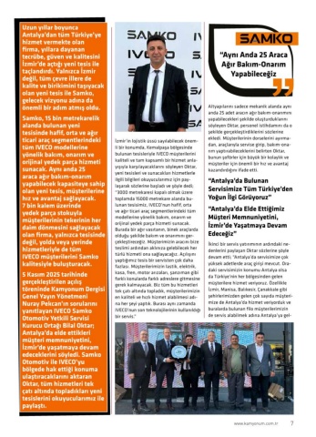 Uzun yıllar boyunca Antalya’dan tüm Türkiye’ye hizmet vermekte olan firma, yıllara dayanan tecrübe, güven ve kalitesini İzmir’de açtığı yeni tesis ile taçlandırdı. Yalnızca İzmir değil, tüm çevre illere de kalite ve birikimini taşıyacak olan yeni tesis ile Samko, gelecek vizyonu adına da önemli bir adım atmış oldu.Samko, 15 bin metrekarelik alanda bulunan yeni tesisinde hafif, orta ve ağır ticari araç segmentlerindeki tüm IVECO modellerine yönelik bakım, onarım ve orijinal yedek parça hizmeti sunacak. Aynı anda 25 araca ağır bakım-onarım yapabilecek kapasiteye sahip olan yeni tesis, müşterilerine hız ve avantaj sağlayacak. 7 bin kalem üzerinde yedek parça stokuyla müşterilerinin tekerinin her daim dönmesini sağlayacak olan firma, yalnızca tesisinde değil, yolda veya yerinde hizmetleriyle de tüm IVECO müşterilerini Samko kalitesiyle buluşturacak.5 Kasım 2025 tarihinde gerçekleştirilen açılış töreninde Kamyonum Dergisi Genel Yayın Yönetmeni Nuray Pekcan’ın sorularını yanıtlayan IVECO Samko Otomotiv Yetkili Servisi Kurucu Ortağı Bilal Oktar; Antalya’da elde ettikleri müşteri memnuniyetini, İzmir’de yaşatmaya devam edeceklerini söyledi. Samko Otomotiv ile IVECO’yu bölgede hak ettiği konuma ulaştıracaklarını aktaran Oktar, tüm hizmetleri tek çatı altında topladıkları yeni tesislerini okuyucularımız ile paylaştı.İzmir’in lojistik üssü sayılabilecek önem-li bir konumda, Kemalpaşa bölgesinde bulunan tesisleriyle IVECO müşterilerini kaliteli ve tam kapsamlı bir hizmet anla-yışıyla karşılayacaklarını söyleyen Oktar, yeni tesisleri ve sunacakları hizmetlerle ilgili bilgileri okuyucularımız için pay-laşarak sözlerine başladı ve şöyle dedi; “3000 metrekaresi kapalı olmak üzere toplamda 15000 metrekare alanda bu-lunan tesisimiz, IVECO’nun hafif, orta ve ağır ticari araç segmentlerindeki tüm modellerine yönelik bakım, onarım ve orijinal yedek parça hizmeti sunacak. Burada bir ağır vasıtanın, binek araçlarda olduğu şekilde bakım ve onarımını ger-çekleştireceğiz. Müşterimizin aracını bize teslimi ardından aklınıza gelebilecek her türlü hizmeti ona sağlayacağız. Açılışını yaptığımız tesis bir servisten çok daha fazlası. Müşterilerimizin lastik, elektrik, kasa, fren, motor arızaları, şanzıman gibi farklı konularda farklı adreslere gitmesine gerek kalmayacak. Biz tüm bu hizmetleri tek çatı altında topladık, müşterilerimizin en kaliteli ve hızlı hizmet alabilmesi adı-na her şeyi yaptık. Burası aynı zamanda IVECO’nun son teknolojilerinin kullanıldığı bir servis.”“Aynı Anda 25 Araca Ağır Bakım-Onarım YapabileceğizAltyapılarını sadece mekanik alanda aynı anda 25 adet aracın ağır bakım-onarımını yapabilecekleri şekilde oluşturduklarını söyleyen Oktar, personel istihdamını da o şekilde gerçekleştirdiklerini sözlerine ekledi. Müşterilerinin dorselerini ayırma-dan, araçlarıyla servise girip, bakım-ona-rım yaptırabileceklerini belirten Oktar, bunun şoförler için büyük bir kolaylık ve müşteriler için önemli bir hız ve avantaj kazandırdığını ifade etti.“Antalya’da Bulunan Servisimize Tüm Türkiye’den Yoğun İlgi Görüyoruz”“Antalya’da Elde Ettiğimiz Müşteri Memnuniyetini, İzmir’de Yaşatmaya Devam Edeceğiz”İkinci bir servis yatırımının ardındaki ne-denlerini paylaşan Oktar sözlerine şöyle devam etti; “Antalya’da servisimize çok yüksek adetlerde araç girişi mevcut. Ora-daki servisimizin konumu Antalya olsa da Türkiye’nin her bölgesinden gelen müşterilere hizmet veriyoruz. Özellikle İzmir, Manisa, Balıkesir, Çanakkale gibi şehirlerimizden gelen çok sayıda müşteri-mize de Antalya’da hizmet veriyorduk ve buralarda bulunan filo müşterilerimizin de servis alabilmek adına Antalya’ya gel-7www.kamyonum.com.tr