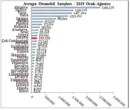 2019 Ağustos ayı sonunda Türkiye, %43,94 azalış ile Avrupa otomobil satışları sıralamasında