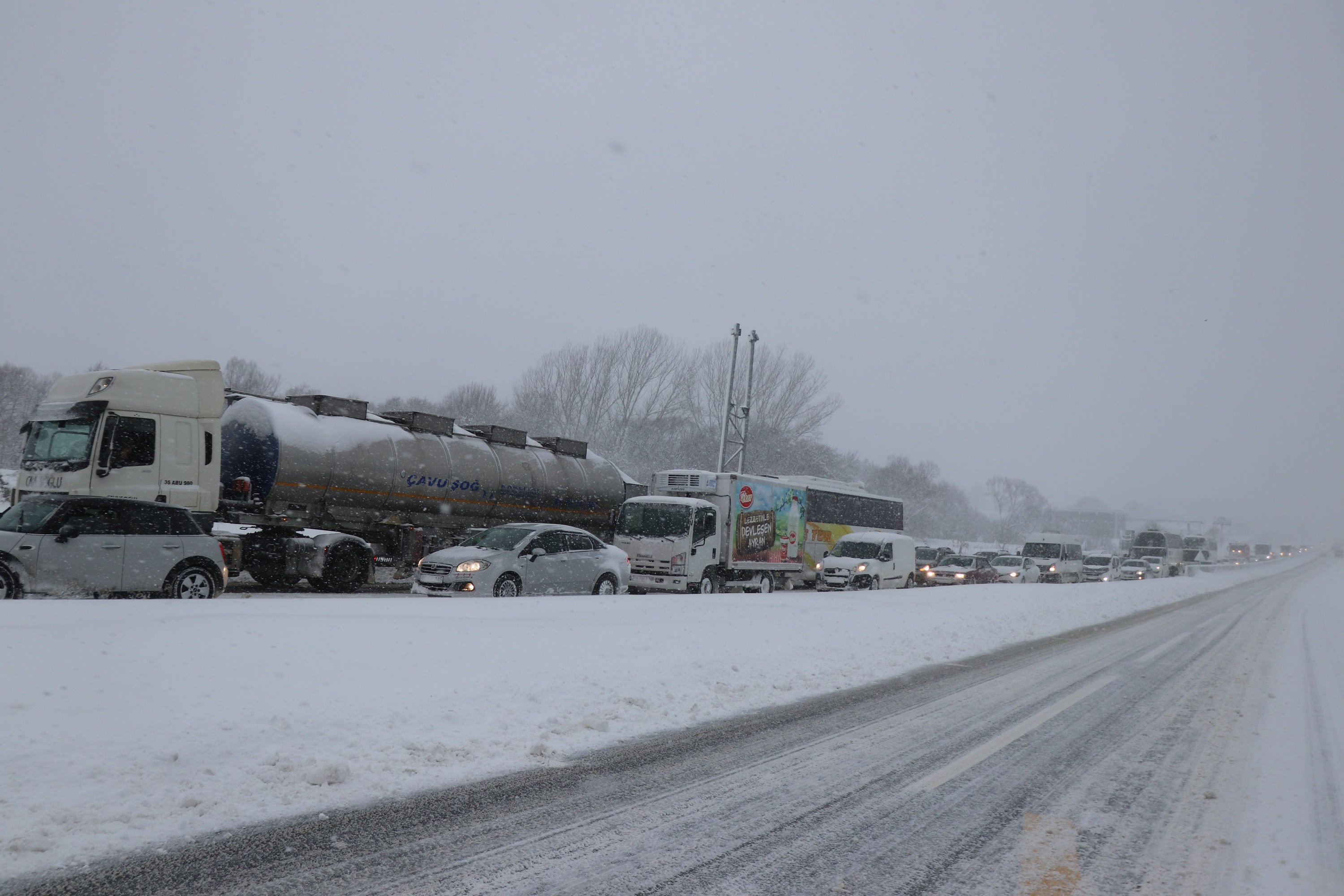 Bolu Dağı’nın D-100 karayolu ve TEM Otoyolu geçişinde dün başlayan yoğun kar yaşı sabah saatlerinden itibaren şiddetini artırdı. Bolu Dağı’nın özellikle D-100 karayolu geçişinde etkisini artıran kar yağışı zaman zaman trafiğin durmasına neden oldu. Bolu yönünden İstanbul istikametine giden tırlar, D-100 karayolu Elmalık kavşağında trafik ekipleri tarafından durdurularak geri gönderiliyor. Ankara istikametinde ise Kaynaşlı mevkisinde yağışın yoğun olduğu zamanlarda ağır tonajlı araçların geçişine izin verilmiyor. Karayolları ekiplerinin yolu temizlemesinin ardından araçların geçişine izin veriliyor.