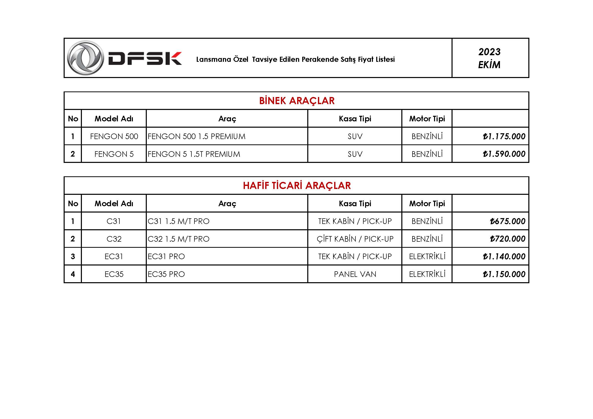 DFSK modellerinin tanıtıldığı toplantıda binek ve ticari modellerin lansmana özel kampanyalı fiyatları da açıklandı. DFSK’nın binek modelleri Fengon 500 1.5 Premium SUV 1.175.000 TL’den, DFSK Fengon 5 1.5T Premium SUV ise 1.590.000 TL’den başlayan fiyatlarla showwromlardaki yerini aldı.