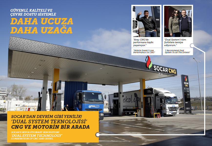Dünyanın önde gelen Azerbaycan Devlet Petrol Şirketi SOCAR’dan devrim niteliğinde bir yenilik! Ağır vasıta araçlarda dizel motorlarda tüketilen motorinin bir kısmı yerine doğalgaz (CNG) kullanılmasını ve motorinle CNG’nin birlikte tüketimini sağlayan DUAL SYSTEM, yeni ve yüksek teknolojisiyle büyük tasarruf sağlarken menzil sıkıntısını da ortadan kaldırıyor.