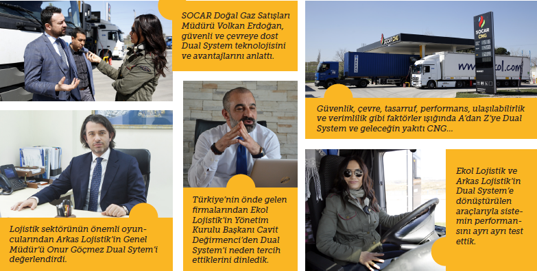 Öncelikle dünyadaki bu tip çalışmalar konusuna değinmek istiyorum ki bu noktada bizim sistemimizin önemi bu noktada öne çıkıyor. Scania, Volvo, Renault, Iveco gibi üretici firmaların hem LNG hem de CNG konusunda ciddi yatırımları var. Sizin istasyonunuz yok ise o araçların burada satılabiliyor olması mümkün değildir. İstasyonlarımızın yaygınlaşmasıyla beraber bu tür firmalarla da görüşmelerimiz devam ediyor. SOCAR, ‘Türkiye’nin Enerjisi’ sloganıyla yola çıktığı için akaryakıt ve doğalgaz satışlarında ön planda olmak durumunda. Bununla birlikte istasyonlar açarak OEM firmalarının CNG ve LNG’li araçlara tamamen dönene kadar ki geçiş sürecinde DUAL SYSTEM’i ön plana çıkardı.
