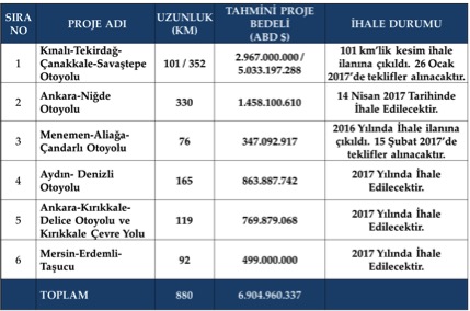 2017 Yılında YİD Modeli ile İhale Edilecek Otoyol Projeleri