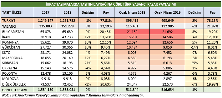2019 Yılı Ocak-Nisan toplamında Türkiye’nin ihracat yükünü taşıyan Yabancı araçlar arasında ilk sırada yer alan Bulgaristan taşıma sayısını 3% artırarak 21.692 adet taşıma gerçekleştirmiştir. Hemen ardında yer alan İran ise -4% düşüş ile 14.582 adet ihracat taşıması gerçekleştirmiştir. Artış gösteren ülkeler arasında 25% artış ile Sırbistan dikkat çekmektedir.