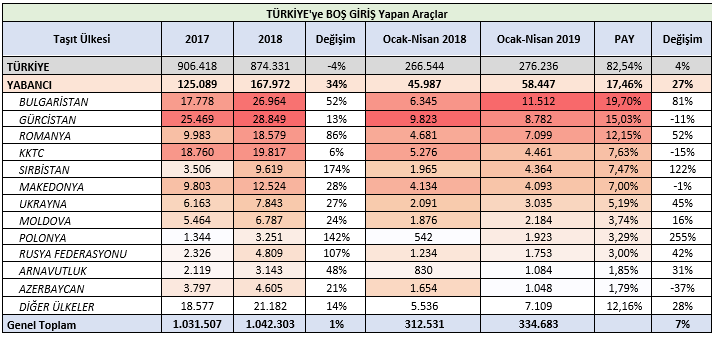 2019 yılının ilk 4 ayında, Türk araçları boş dönüş sayılarında %4 artış yaşamalarına karşın Yabancı araçlar ise Türkiye’ye boş girişler sayılarını %27 oranında artırdılar.