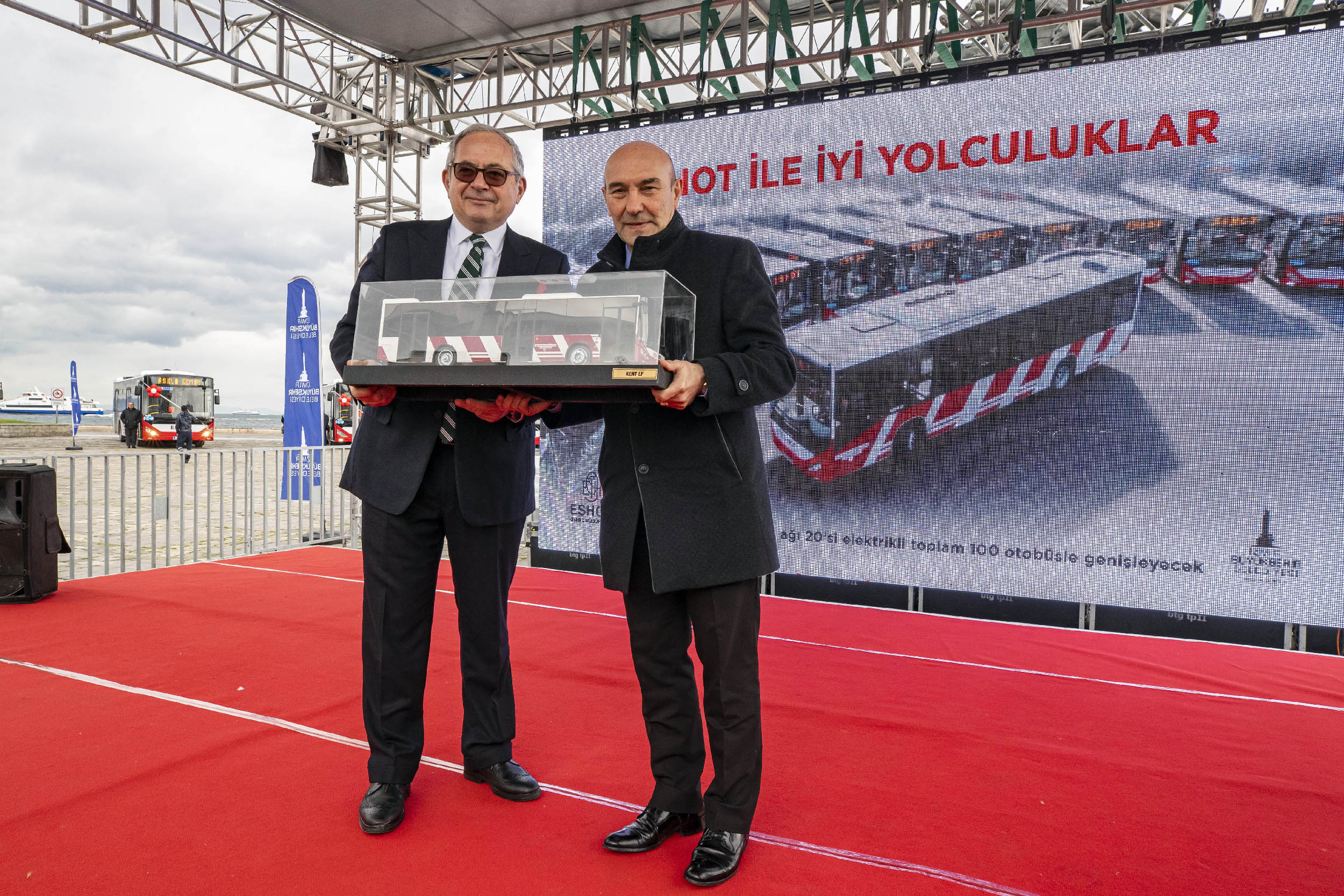 Törende yapılan konuşmaların ardından Otokar Genel Müdürü Serdar Görgüç İzmir Büyükşehir Belediye Başkanı Tunç Soyer’e bir otobüs maketi hediye etti.