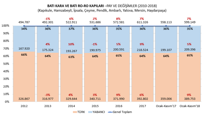 Yabancı araçların ise geçen yıl Kasım ayında 31.131 adet olan taşıma sayıları 2018 yılı Kasım ayında %2 artış ile 31.862 adet oldu. Ocak-Kasım toplamında bir önceki yılın aynı dönemine göre %6 büyüme ile 321.357 adet taşıma gerçekleştirdiler.