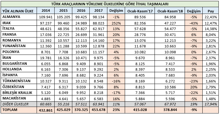 İlk 11 ayda, Türk araçlarının İthalat taşımalarında yük aldığı ülkelere bakıldığında, ilk sırada 84.958 adet taşıma ile Almanya geliyor. ikinci sırada İtalya ve üçüncü sırada Irak, dördüncü sırada ise Fransa yer almaktadır. Diğer ithalatımızın yüksek olduğu ülkeler arasında Romanya, Yunanistan, Polonya, Bulgaristan, Hollanda gibi Avrupa ülkeleri çoğunluktadır.